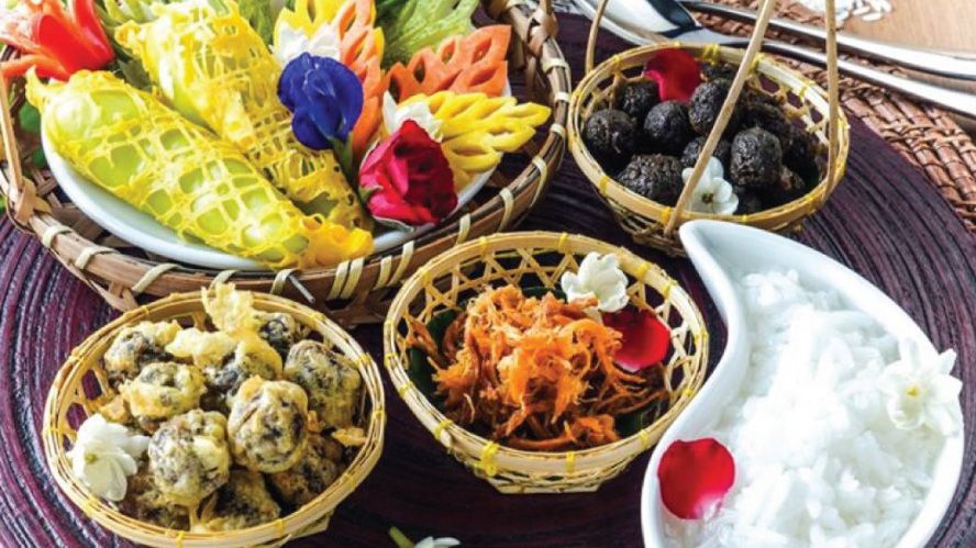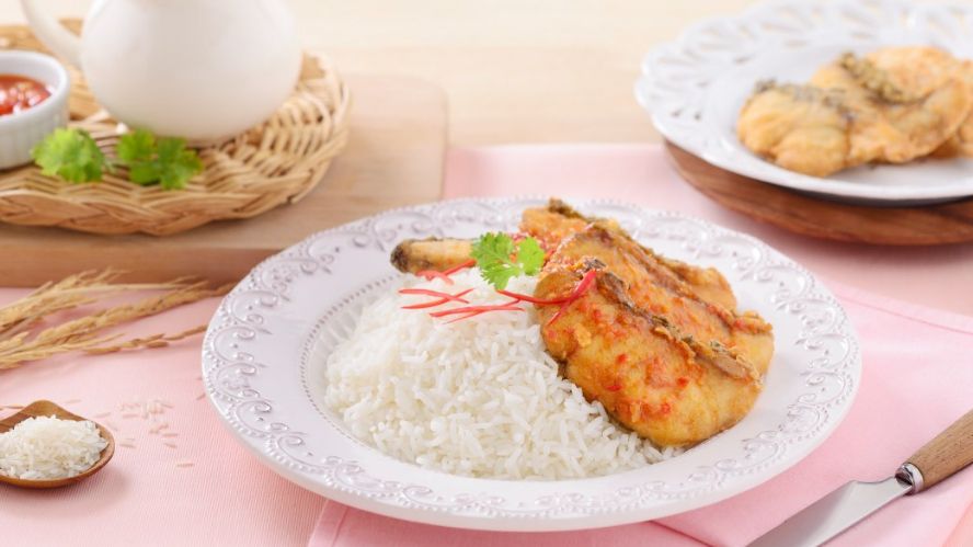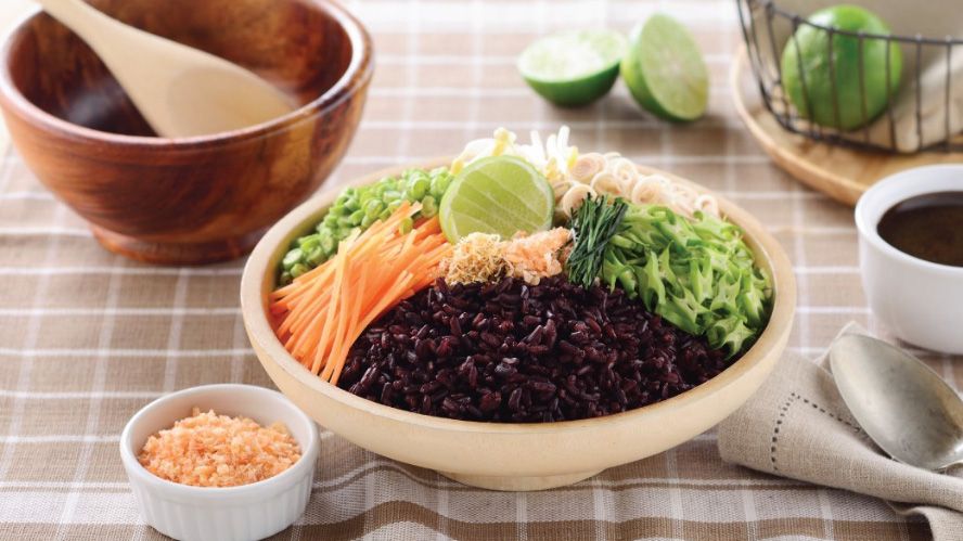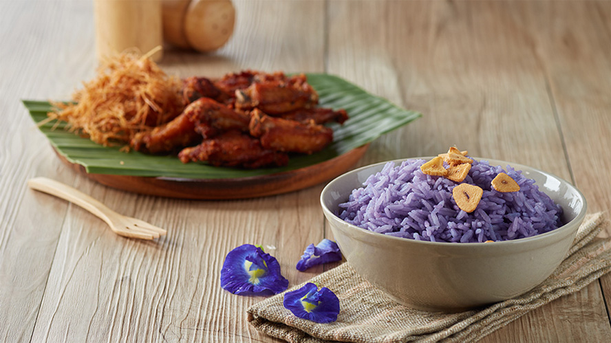 ข้าวกระเทียมอัญชันไก่ทอดตะไคร้กรอบ